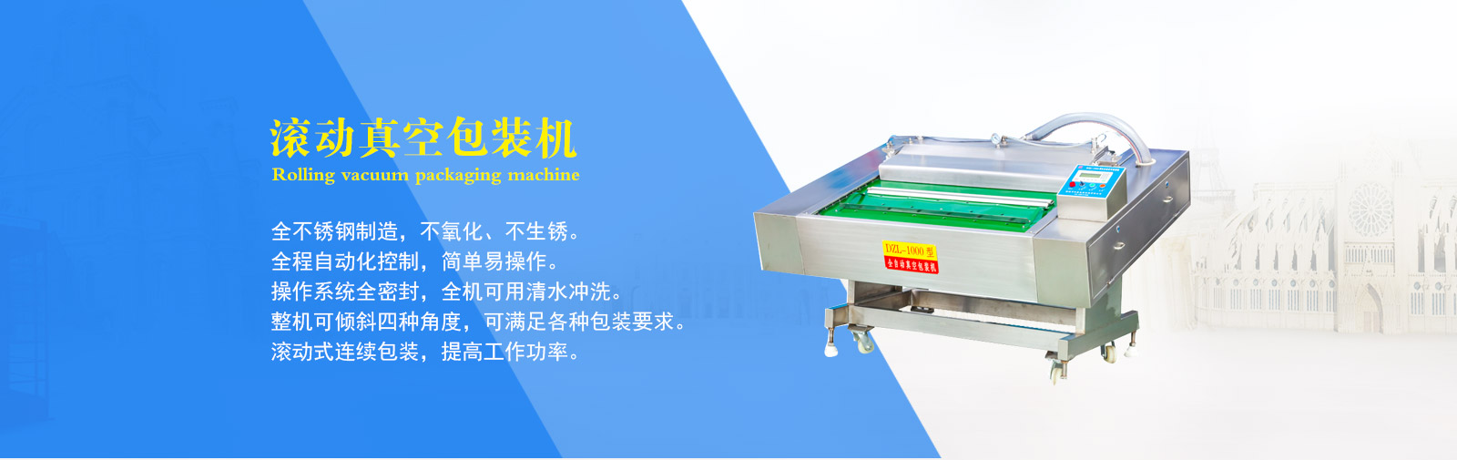 公司專業(yè)制造生產(chǎn)真空包裝機(jī)、拉伸膜真空包裝機(jī)、盒式真空包裝機(jī)、斬拌機(jī)、滾揉機(jī)、鹽水注射機(jī)、巴氏殺菌流水線等食品機(jī)械。其中生產(chǎn)的DZL-420全自動(dòng)拉伸膜真空包裝機(jī)、DZL-1000型連續(xù)自動(dòng)真空包裝機(jī)、真空滾揉機(jī)、斬拌機(jī)、鹽水注射機(jī)等都是通過本市技術(shù)監(jiān)督局檢驗(yàn)合格的產(chǎn)品。